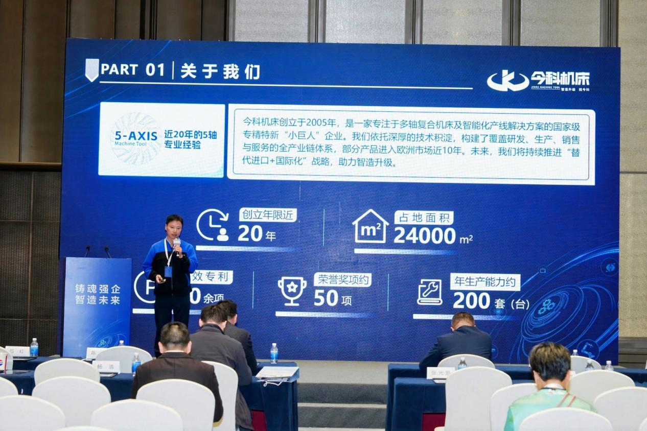 今科机床销售总监杨发 以《迈向智能制造:五轴复合加工中心与 CAM 软件协同,引领精密零件加工新趋势》为题,介绍了今科高端数控机床矩阵,并结合航空航天、新能源等领域的应用案例,阐释了五轴设备与QJCAM 软件协同对精密加工的价值增益。