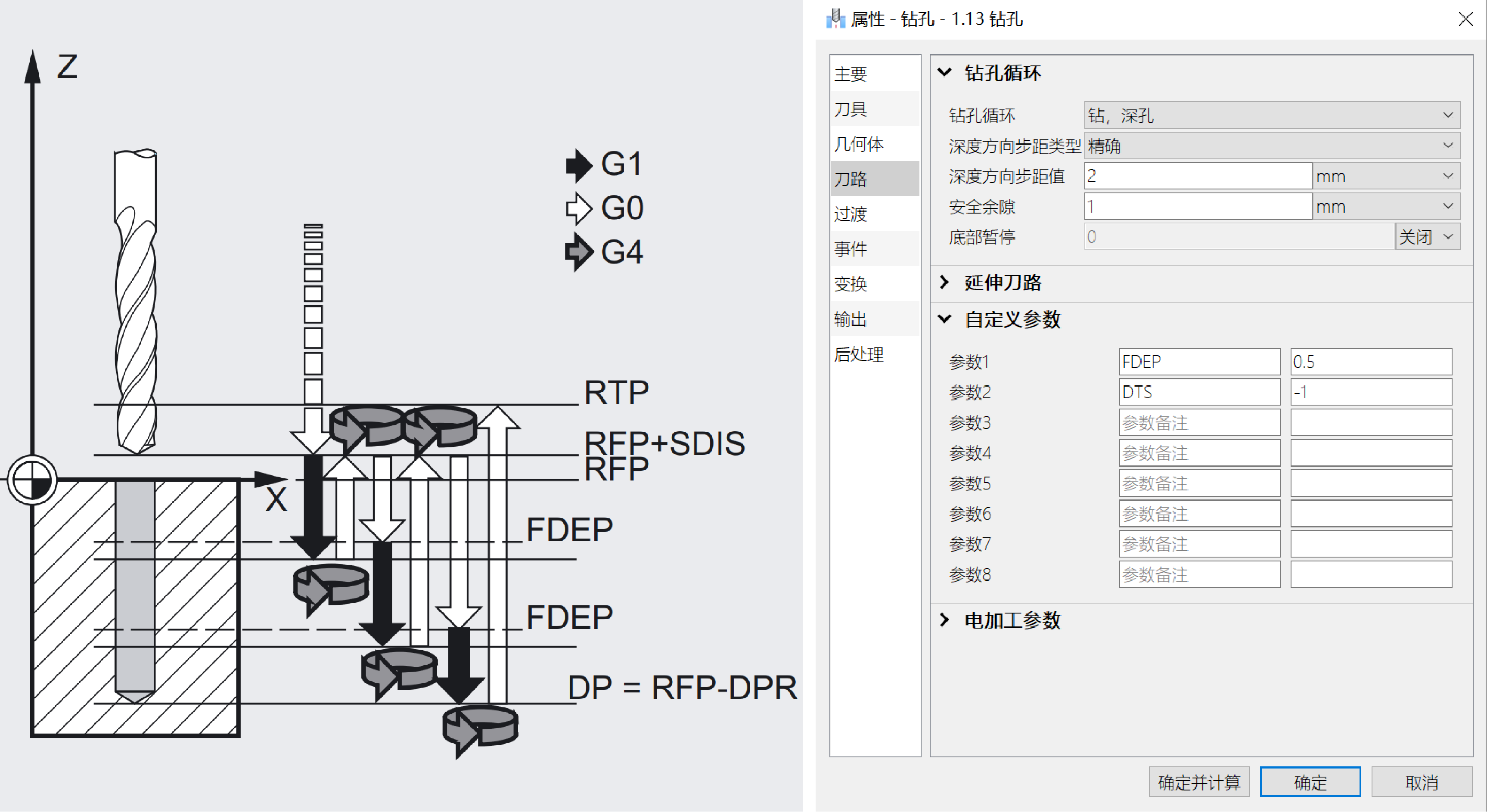 示例:在SIEMENS系统下的CYCLE83深孔钻削加工中,用户可通过自定义参数输出DTS(顶部暂停时间)、FDEP(首次钻削深度)等非常用循环参数。如示例中DTS -1代表顶部暂停1转,FDEP 0.5代表首次钻削深度0.5mm,后续啄钻深度为2mm。