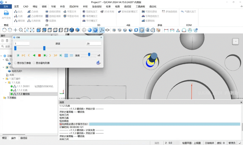 QJCAM.Expert集成智能碰撞检查功能,可在编程阶段快速验证刀路安全性。检查结果直观显示在信息栏,提供多种检查选项,能够精准分析碰撞位置并给出针对性处置建议,从源头规避超程、干涉等加工风险,降低试切成本与工件报废率。